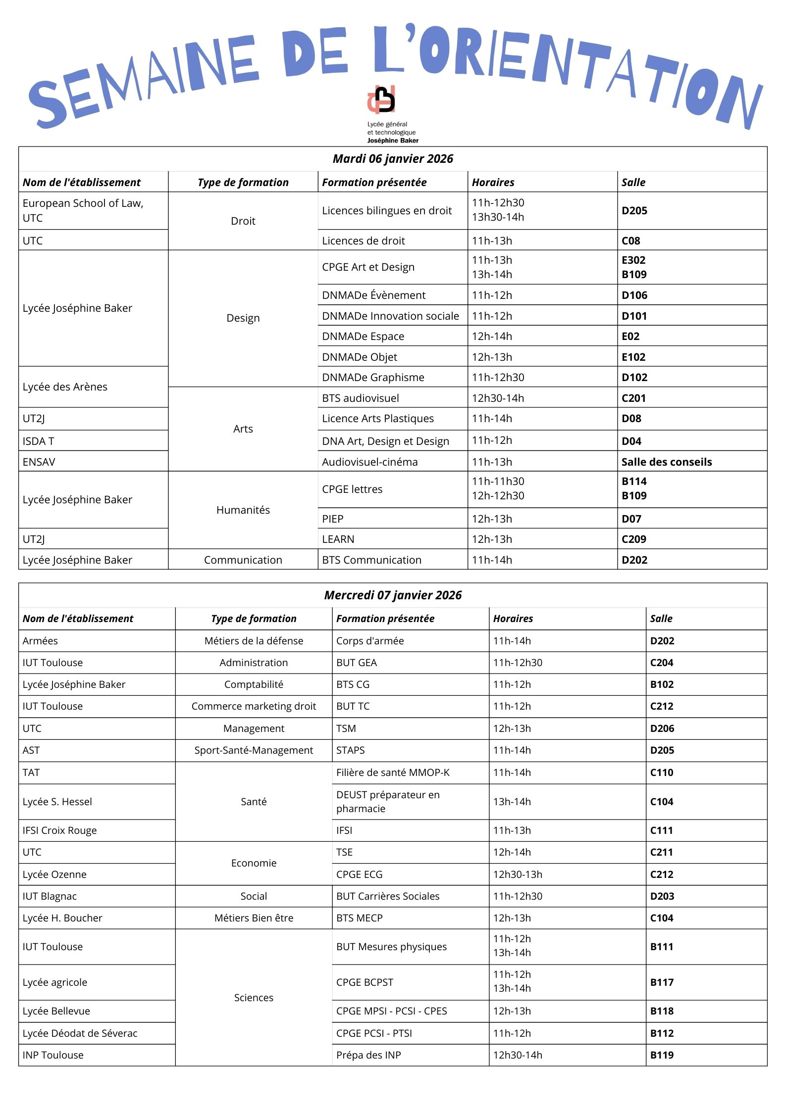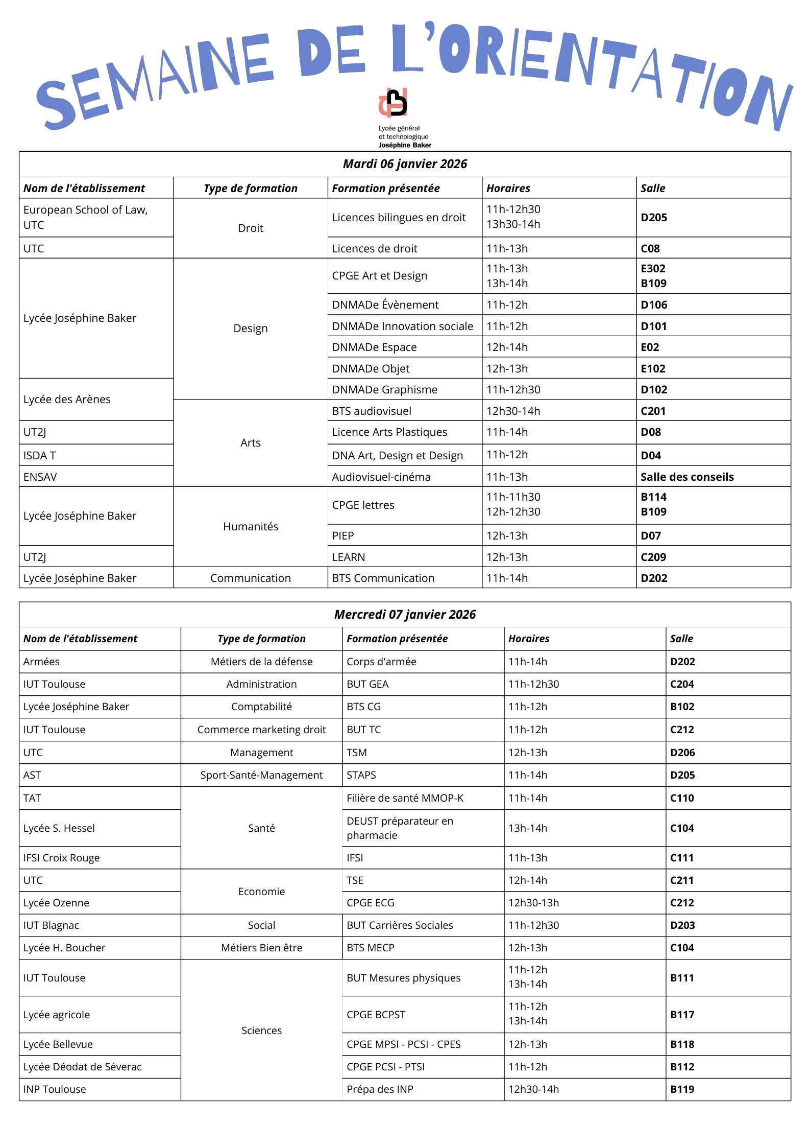 | Mercredi 07 janvier | Entre 11h et 14h | Salles à consulter dans le hall C | Obligatoire sur inscription à la Vie scolaire | Sciences, santé, économie et métiers de la défense |