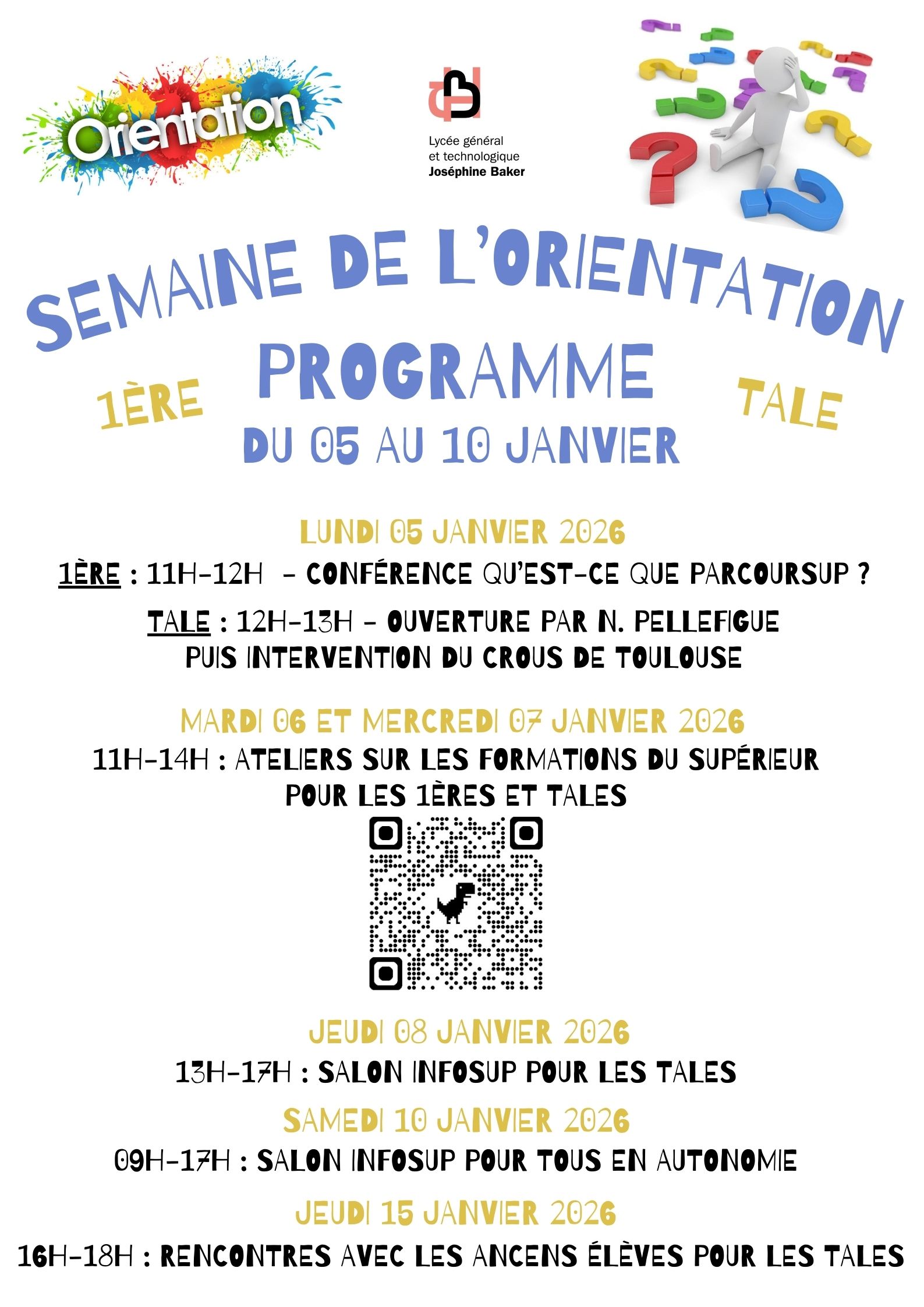 | Jeudi 08 janvier | A partir de 13h | MEETT de Toulouse | Obligatoire en présence de votre professeur(e) principal(e) | Infosup |